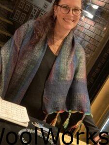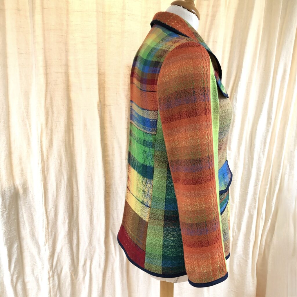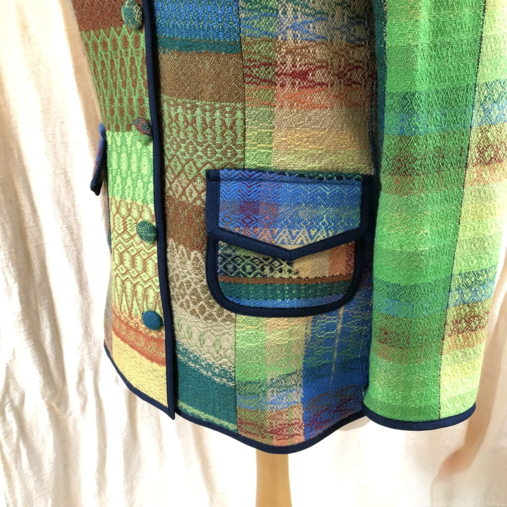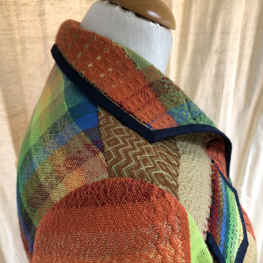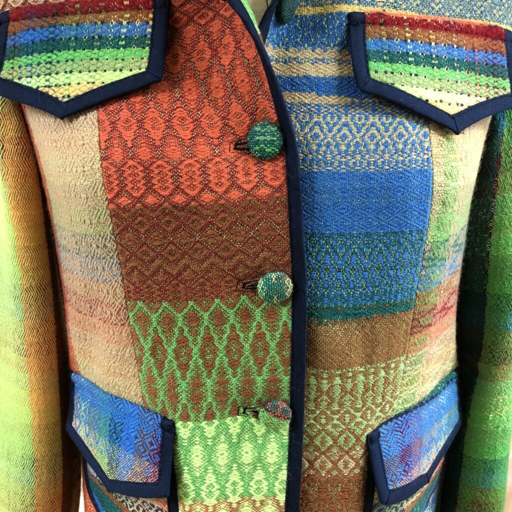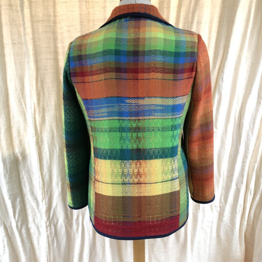 Eerst heb ik een sjaal geweven volgens patroon en met de rest van de schering heb ik  verschillende patronen en kleuren uitgeprobeerd. Van deze “oefen” lap heb ik een jasje genaaid. De sjaal-omslagdoek heeft ondertussen al een nieuwe eigenaresse gevonden.