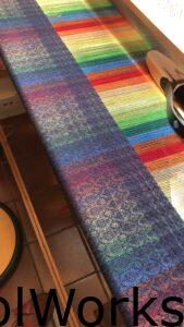 Het patroon voor de sjaal heb ik op de iPad in een weefprogramma app iWeaveIt gemaakt. In deze weefprogramma kun je niet alleen een patroon maken in kleur, maar ook kun je het berekenen hoeveel garen je nodig hebt, het inrijgen van de hevels, eventuele trappers aanbinden enzovoort. Echt super handig voor mij, want ik heb nooit geleerd om met de hand op een papier een weefpatroon te maken.