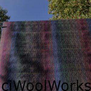 Voor het scheer draden -ook wel ketting draden genoemd- heb ik geel, oranje, beige, lichtgroen, groen, petrol, blauw, rood en bruin kleuren merinoswol weefgaren gekozen. De inslag draad voor de sjaal is een donkerblauw bijna zwarte merinoswol weefgaren. Voor de rest heb ik verschillende kleuren merinoswol weefgaren gebruikt.