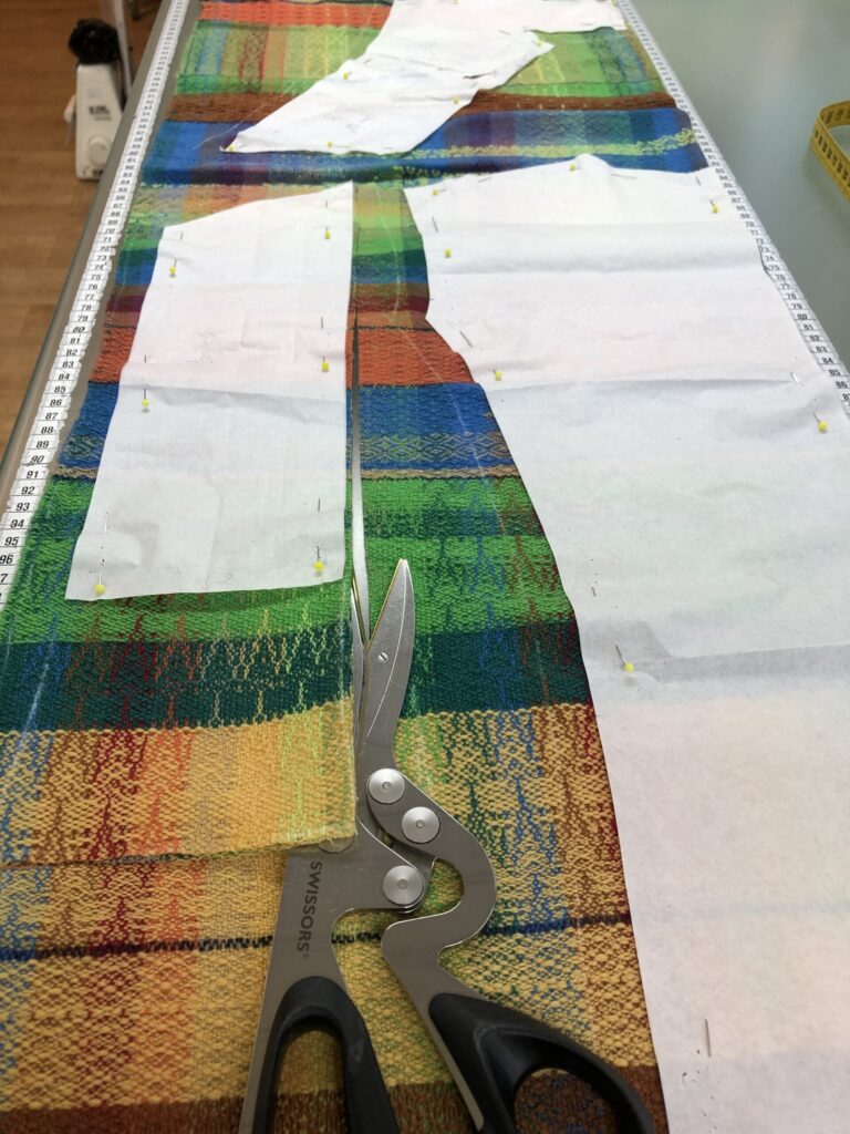 Na het weven heb ik de stof gewassen en na het drogen gestreken. Een naaipatroon voor een jasje had ik al, dus kon ik gelijk beginnen met het puzzelen. Ja, puzzelen. Want het was echt een hele gepuzzel om de patroondelen uit de beschikbare stof te krijgen. Maar het is gelukt!