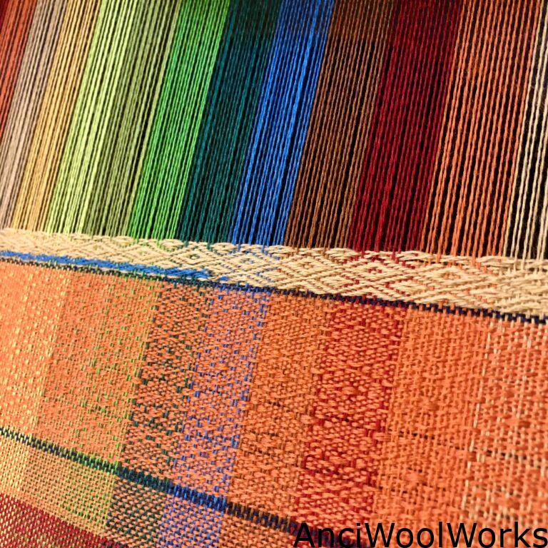 Nadat ik de patroon heb gemaakt en de kleuren heb gekozen kon ik met behulp van de uitgeprinte berekeningen het garen voor de scheer op een scheerplank voorbereiden en op het weefgetouw “scheren” – alle draden op een scheer/ketting-boom (die zit achter op de getouw) draaien-, de hevels inrijgen, het riet inrijgen en als laatste het einde van de draden vastmaken aan de voorkant op de doekboom.