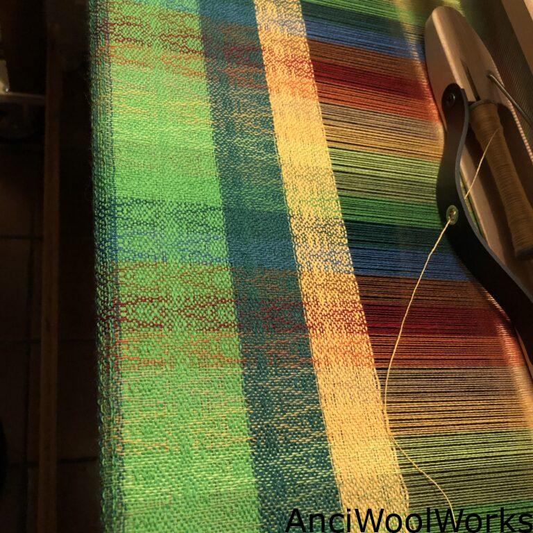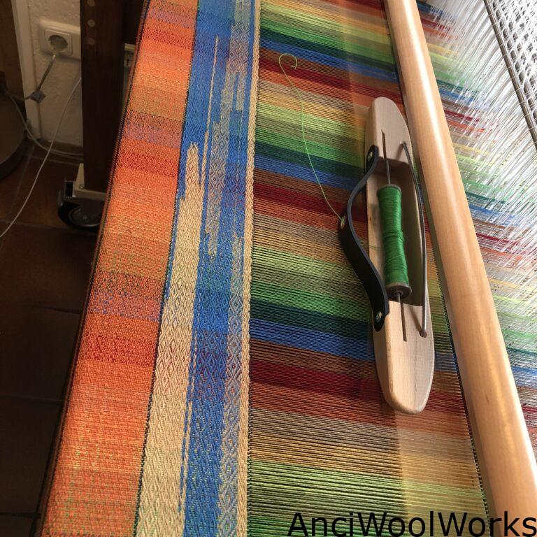 Nadat alle draden parallel opgespannen in de weefgetouw zitten, spoelen zijn vol en in de schuit geplaatst, kan ik beginnen met weven.