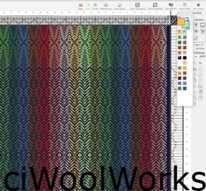 Het patroon voor de sjaal heb ik op de iPad in een weefprogramma app iWeaveIt gemaakt. In deze weefprogramma kun je niet alleen een patroon maken in kleur, maar ook kun je het berekenen hoeveel garen je nodig hebt, het inrijgen van de hevels, eventuele trappers aanbinden enzovoort. Echt super handig voor mij, want ik heb nooit geleerd om met de hand op een papier een weefpatroon te maken.